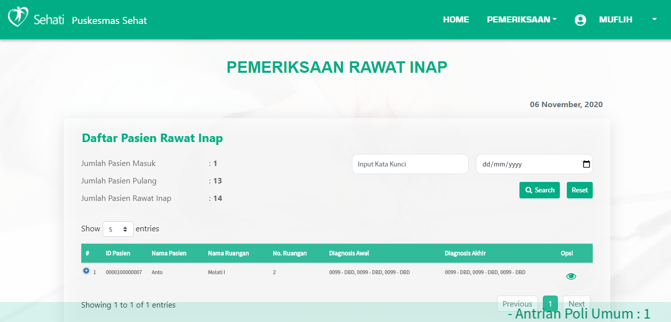 Mencari riwayat pemeriksaan pasien rawat jalan yang sudah pernah dilayani dengan pencarian nama atau tanggal sesuai dengan kebutuhan dan dapat melihat detail hasil pemeriksaan pasien rawat jalan yang sudah dilayani.