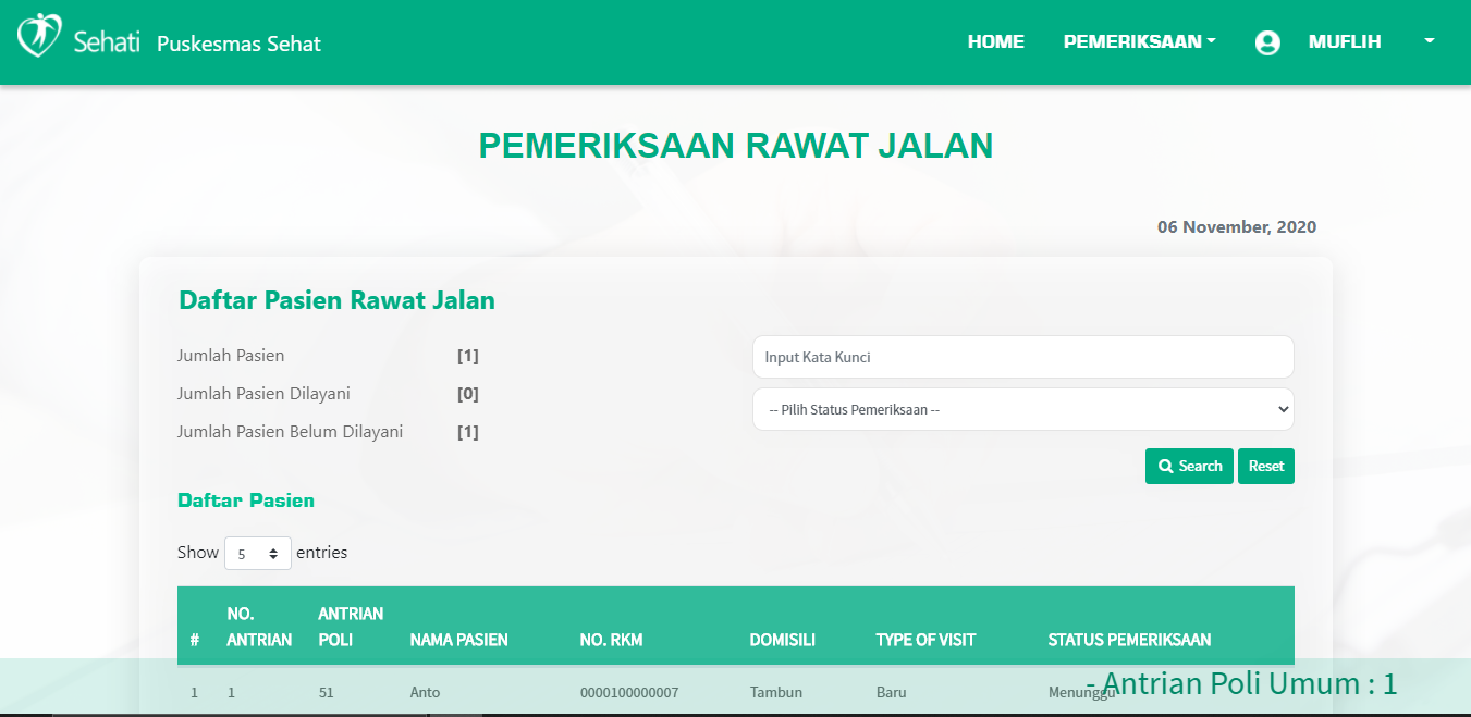 Memproses pemeriksaan pasien Rawat Jalan dan pencarian pasien sesuai status pemeriksaan.