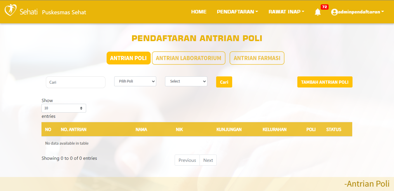 Mendaftarkan Antrian Poli, Antrian Laboratorium dan Antrian Farmasi dengan mudah dan cepat sehingga mempermudah bagian administrasi pendaftaran tentunya.